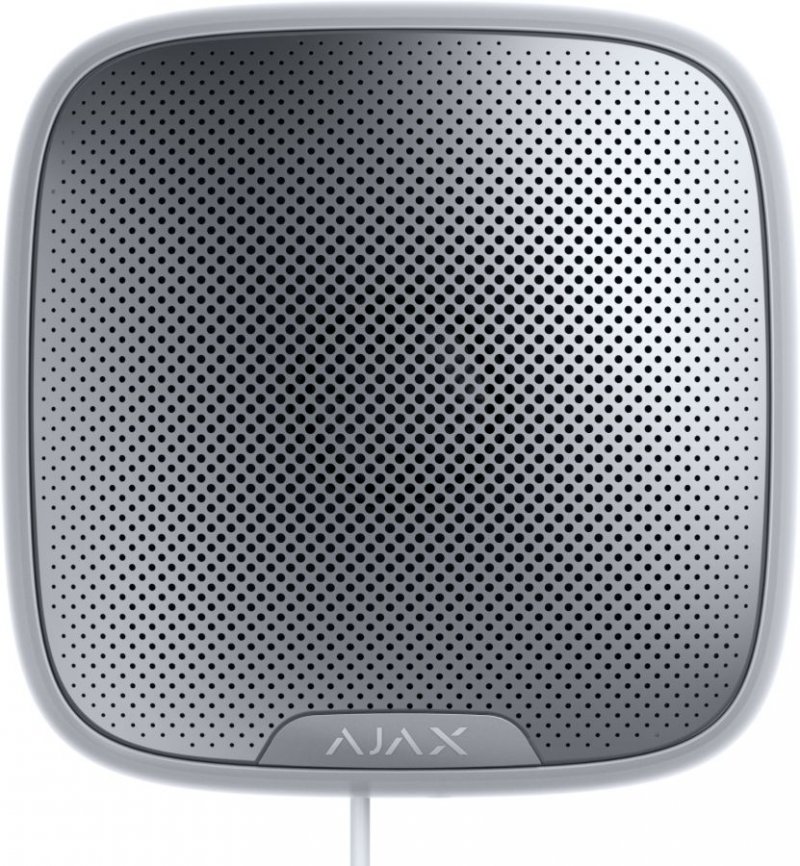 Drôtová vonkajšia siréna. Intenzitu akustickej signalizácie je možné ľubovoľne nastaviť v rozmedzí 85 až 113 dB. Siréna disponuje vysoko svietivými červenými LED diódami umiestnenými po celom obvode krytu. Siréna je pripojená drôtovo k zabezpečovaciemu systému Ajax pomocou zabezpečeného protokolu Fibra a dosah káblového pripojenia je až 2000 metrov pri pripojení pomocou krúteného páru U/UTP kat.5.