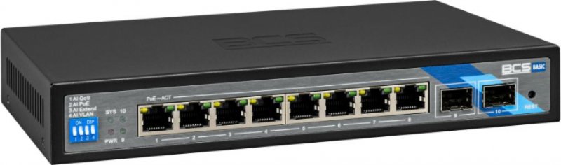 8 portový switch (8×PoE) 1000Mbps + 2×Gb SFP so 4 prevádzkovými režimami; VLAN, EXTEND, PoE, QoS; Funkcie MDI/MDIX, VLAN; Prenos do 250m; Napájanie switch PoE 96W max 30W/port; Napájanie 52V DC 1.85A; Rozmery 225×120×35mm, 0.8kg