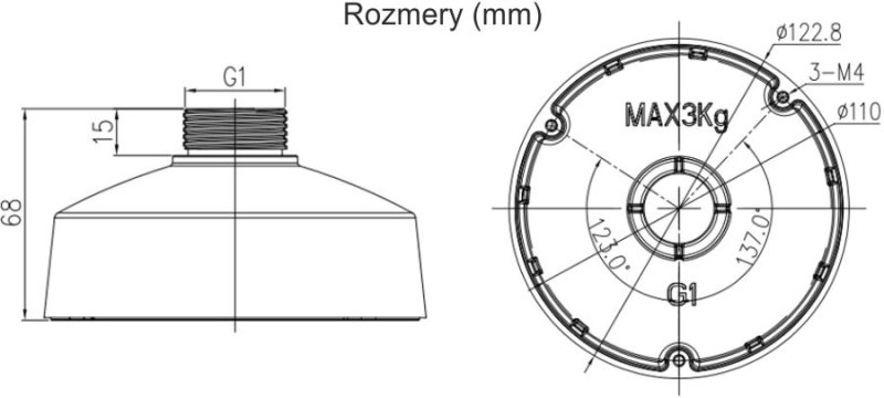 Montážny adaptér držiaka pre varifokálnu dome kameru; Nosnosť: 3 kg; Materiál: zliatina hliníka; Rozmery: φ122.8 × 68 mm; Hmotnosť: 0.17 kg