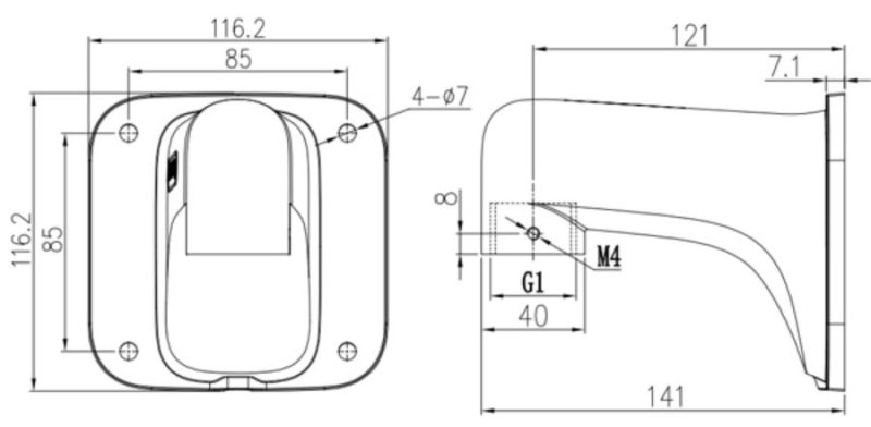 Nástenný držiak; Pre montáž dome, turret a fisheye kamier je nutné použiť montážny adaptér; Nosnosť: 3 kg; Materiál: zliatina hliníka; Rozmery: 141 × 116.2 × 116.2 mm; Hmotnosť: 0.25 kg
