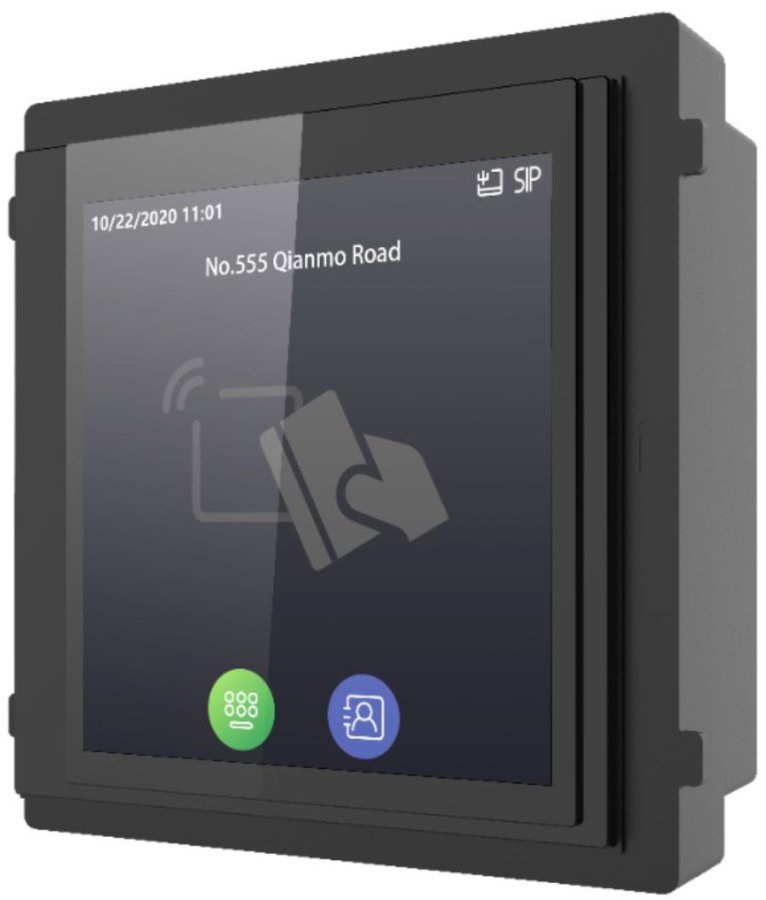 Modul s dotykovým displejom a Mifare čítačkou pre pripojenie k modulárnemu videovrátniku Hikvision; 4" farebný dotykový displej; Rozlíšenie 480x480; Čítačka Mifare kariet, frekvencia 13,56 MHz; Displej s číselníkom, otváranie cez pin kód a kartu, zoznam kontaktov, možnosť zobraziť reklamu; RS-485 pre pripojenie modulov (vstup a výstup); Napájanie zo susedného modulu (12VDC); Spotreba <10W; IP65; IK8.