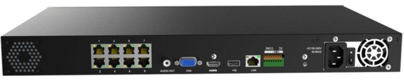 NDAA 4K PoE NVR pre 8 IP kamier; 8x POE 200W; vstupný dátový tok 80 Mbps/ výstupný 50 Mbps; podpora kamier až do rozlíšenia 8 MP; H.265+/H.265/H.264+/H.264; synchronizované prehrávanie; videoanalýza obrazu; podpora LPR kamier pre rozpoznávanie ŠPZ vozidiel; 2× SATA HDD do 10 TB (3.5"); 1× RJ45 (10/100/1000Mbps); 2× USB2.0; audio 1/1; alarm 4/1; 1x HDMI a VGA výstup; napájanie AC