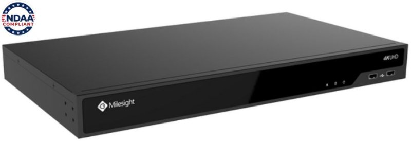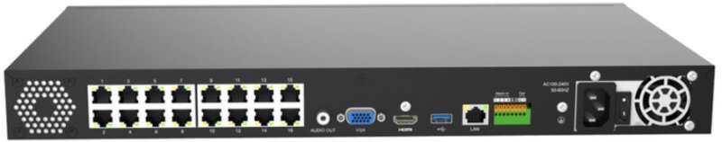 NDAA 4K PoE NVR pre 16 IP kamier; 16x POE 200W; obojsmerný dátový tok 160 Mbps; podpora kamier až do rozlíšenia 8 MP; H.265+/H.265/H.264+/H.264; synchronizované prehrávanie; videoanalýza obrazu; podpora LPR kamier pre rozpoznávanie ŠPZ vozidiel; 2× SATA HDD do 10 TB (3.5"); 1× RJ45 (10/100/1000Mbps); 2× USB2.0; audio 1/1; alarm 4/1; 1x HDMI a VGA výstup; napájanie AC 100V~240V; rozmery 380mm(š) x 317.6mm(h) x 51.8mm(v); hmotnosť 2.7kg. HDD nie je súčasťou.