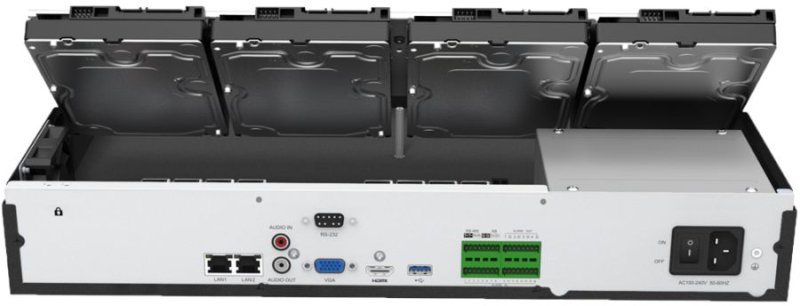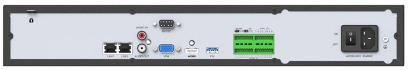 4K NVR pre 32 IP kamier; bez PoE; obojsmerný dátový tok 256Mbps/RAID; podpora kamier až do rozlíšenia 12MP; H.265+/H.265/H.264+/H.264/G.711; 2x LAN; synchronizované prehrávanie; videoanalýza obrazu; podpora LPR kamier pre rozpoznávanie ŠPZ vozidiel; 4× SATA HDD do 10 TB (3.5"); podpora RAID; 2× RJ45 (10/100/1000Mbps); 1× USB3.0, 2× USB2.0; audio 1/1; alarm 16/4; 1x RS232, 2x RS485;