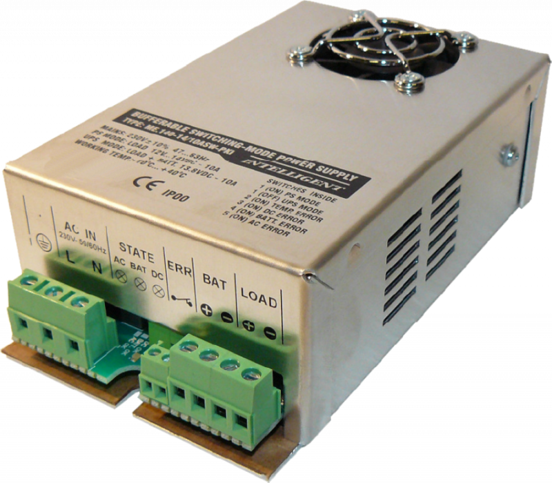 Input: 230 V ±10 % 47...63 Hz 1.22 A; Insulation class: I.; Protection: IP 00; Rated power: 140 W;Output voltage PS: 12 V to 13.8 VDC; Output voltage UPS: 13.8 VDC; Load current PS: 10 A; Load current UPS: 8 A; Charging current UPS: 2 A; Recommended battery: 12 V/12Ah - 18Ah Error contact: max 30 VDC – 100 mA; Max ambient temperature: -10 °C…+ 40 °C; Dimensions: L=143 W=78 H=44 (mm); Weight: 0.3 kg