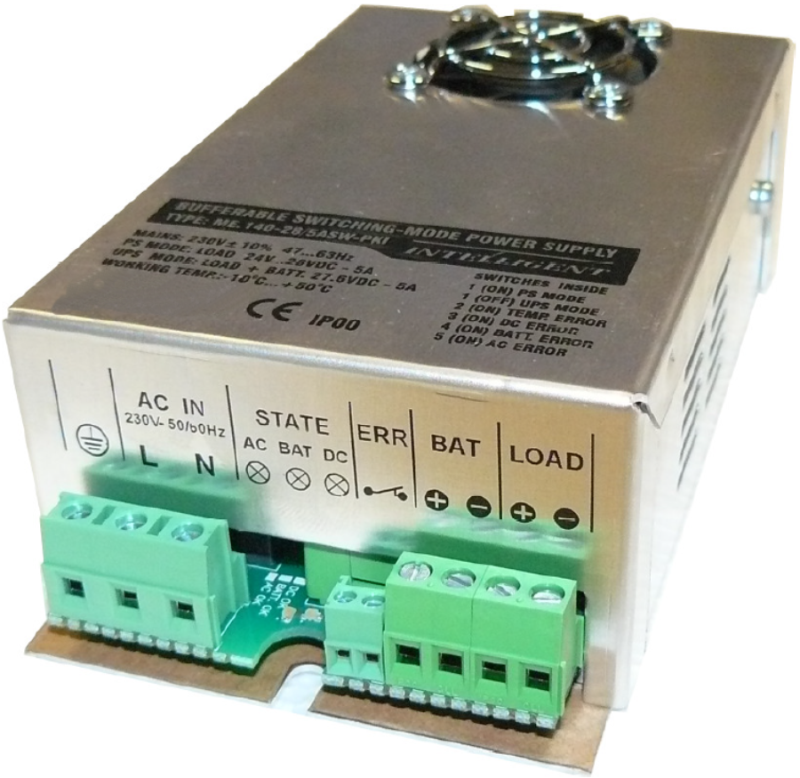 Input: 230 V ±10 % 47...63 Hz 1.22 A; Insulation class: I.; Protection: IP 00; Rated power: 140 W; Output voltage PS: 24 V to 27.6 VDC; Output voltage UPS: 27.6 VDC; Load current PS: 5 A; Load current UPS: 4 A; Charging current UPS: 1 A; Recommended battery: 2×12 V/12Ah – 2×12 V/18Ah; Error contact: max 30 VDC – 100 mA; Max ambient temperature: -10 °C…+ 40 °C; Dimensions: L=143 W=78
