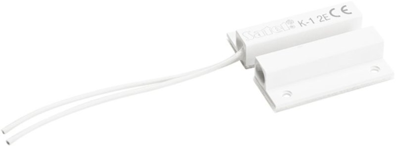 Plastový magnetický kontakt, povrchová montáž, malé rozmery 13,5x33,5x7,3 mm, samolepiaci, pracovná medzera 12 - 15 mm pri dreve, PVC a hliníku, NC kontakt + tamper (dvojité vyváženie - zaliate odpory 2 x 1k1), kábel, biely
