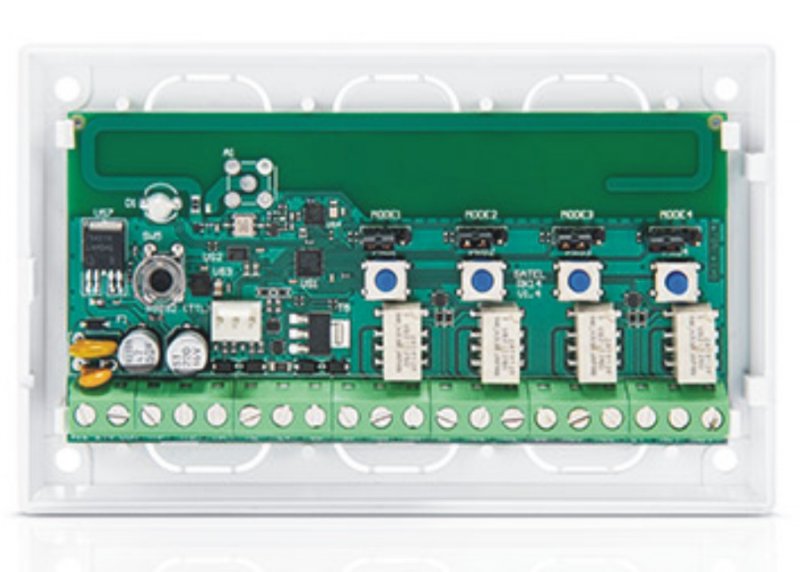 4 kanálový bezdrôtový prijímač 433 MHz, dosah do 350 m na voľnom priestranstve, umožňuje diaľkové ovládanie zariadení pomocou diaľkových ovládačov (max. 1024 DO), SDR chipset, 4x výstup typu relé NO/NC pulse/mono/bi-stabilný, signalizácia slabej batérie v DO výstup LV typu OC, výstup SS typu OC ovládajúci sirénu, 2x vstup na signalizáciu o poplachu a stave
