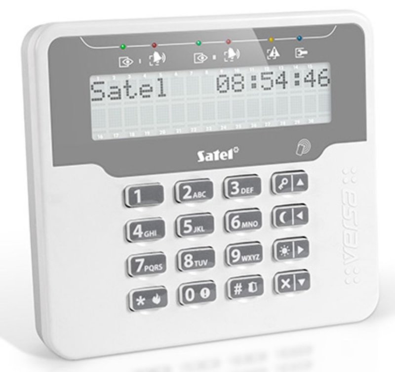 LCD klávesnica s RFID čítačkou pre systém VERSA, veľký, ľahko čitateľný LCD displej, biele podsvietenie, frekvencia čítačky 125 kHz, formát kariet UNIQUE, EM4001, EM4002, EM4003, EM4102, LED diódy indikujú stav skupiny a systému, rýchle zapnutie režimu stráženia, klávesy pre napadnutie-požiar-pomoc, max. odber prúdu 60 mA, rozmery 139 x 124 x 22 mm
