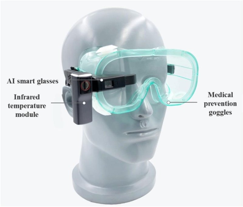 Smart okuliare + Infračervený snímač teploty, rozlíšenie 640x400, vzdialenosť merania 0.5-3m, presnosť ±0.5°C (1.2m), meranie teploty do 5 osôb, teplotný rozsah 20°C - 50°C, rozpoznanie tváre 8m, výdrž batérie pribl. 4 hodiny, podporuje rozpoznanie tváre s maskou